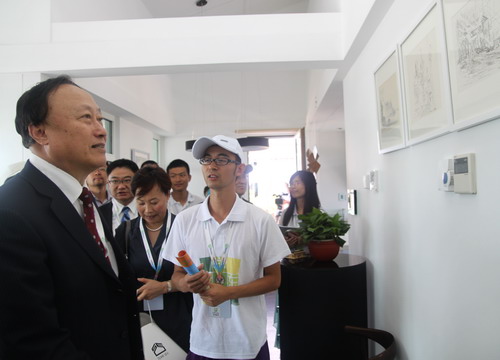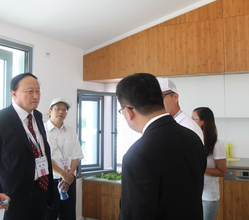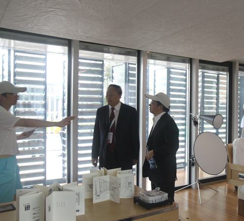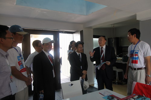 随后,朱善璐书记一行参观了清华大学—佛罗里达国际大学联合赛队、东南大学赛队和以色列赛队的“太阳屋”。赛队负责人都详细讲解了各自“太阳屋”的设计理念和对太阳能资源的有效利用。清华大学—佛罗里达国际大学联合赛队选择最高效的光伏电池板以获得尽可能多的能量,同时使用智能控制系统,使室内生活更加舒适;东南大学赛队以 “简单、舒适、绿色、智能”为其设计理念,应用了被动式太阳能技术和主动式太阳能发电系统;以色列赛队用现代方式阐释了其传统以色列四合院建筑,既有传统被动式的太阳能系统,又融合以色列最先进清洁能源技术。