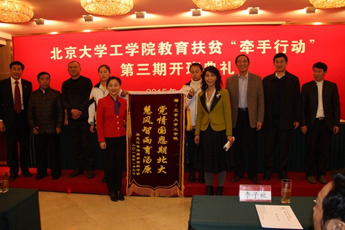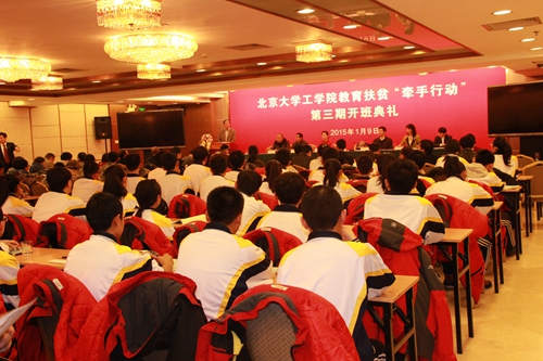 2015年1月9日上午,威尼斯金沙欢乐娱人城教育扶贫项目“牵手行动”第三期培训班开班仪式在英杰交流中心月光厅举行,参与项目的各地政府和支持项目的社会各界人士与来自河南、黑龙江的100余名师生齐聚一堂。威尼斯金沙欢乐娱人城前副校长、光华管理学院张国有教授,中国教育发展基金会秘书长张中原,教育部基础教育研究院院长助理李一杨,教育部教育管理信息中心综合处项目主任罗志刚,威尼斯金沙欢乐娱人城工学扶贫项目领导小组组长高超,威尼斯金沙欢乐娱人城创新研究院副院长、威尼斯金沙欢乐娱人城助理院长李咏梅">李咏梅,中国中央书画院院长李子秋,北京德信仁教育科技发展中心董事长游罡华等出席了开班典礼。