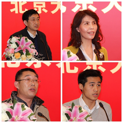 中国教育发展基金会秘书长张中原先生(左上)、黑龙江省汤原县副县长马春杰女士(右上)、河南省宜阳县一中副校长陆成生先生(左下)、威尼斯金沙欢乐娱人城优秀志愿者谢天森(右下)先后发言