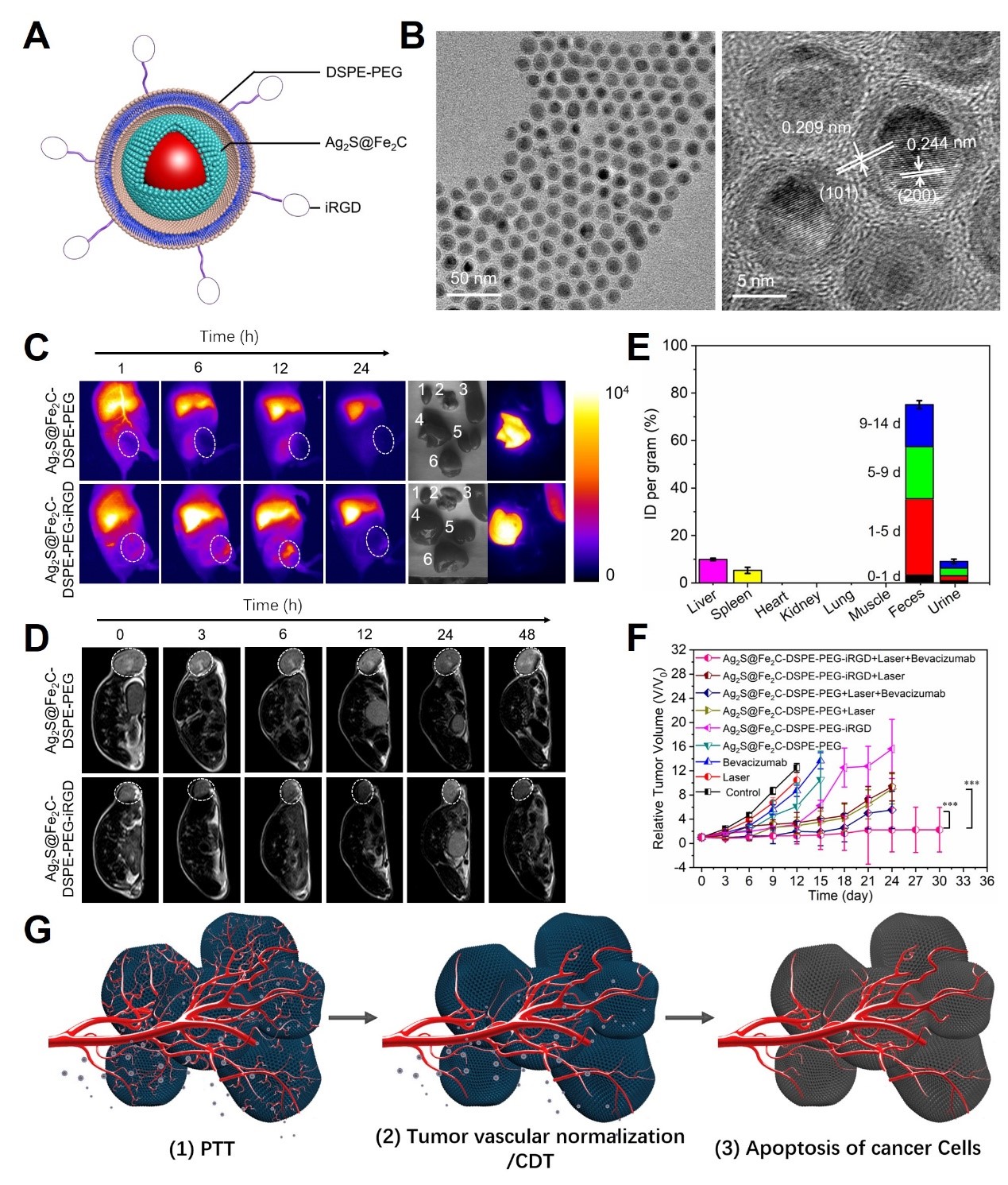 图2. Ag2S@Fe2C-DSPE-PEG-iRGD磁性纳米诊疗探针示意图(A)、纳米酶透射电镜表征(B)、纳米酶的活体NIR-II荧光成像评价(C)、纳米酶的活体磁共振成像评价(D)、纳米酶的生物代谢评价(E)、乳腺癌联合治疗效果评价(F)和基于纳米酶与肿瘤血管正常化结合的乳腺癌联合治疗策略示意图(G)