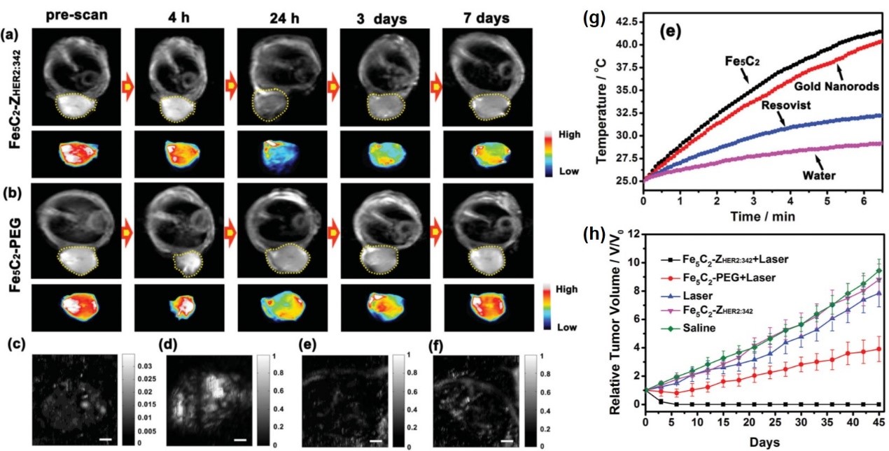 图1. Fe5C2-ZHER2:342磁性纳米探针在活体水平的磁共振成像,光声成像和光热治疗评价