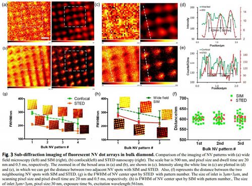 最近,威尼斯金沙欢乐娱人城席鹏">席鹏特聘研究员课题组联合香港大学的Wen-Di Li教授课题组、台湾Huan-Cheng Chang课题组以及清华大学黄蕾博士,分别利用受激辐射光淬灭技术(STED)和结构光照明超分辨技术(SIM),实现了对NV center的超光学极限分辨率的显微成像对比。