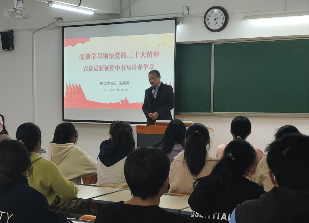 最后,朱德顺从理想、学习、科学、创新、实践与责任等八大方面向各位学生提出了期许,祝愿同学们在今后的学习生活中有更好的发展,他勉励学生:要积极的投入新时代社会主义建设过程中,要深刻认识到身上所肩负的历史重任,青春逢盛世,奋斗正当时,青年学子要坚定立场、学好本领,在不懈奋斗中成为未来的栋梁之才。整堂课既有理论高度,又紧贴实际,既有宏观视野,又具现实指导性,语言生动、案例鲜活让青年学子们对党的二十大有了更深入的了解,结合自身找到未来学习和发展的方向,是一堂有温度、有深度、高质量的思政课。