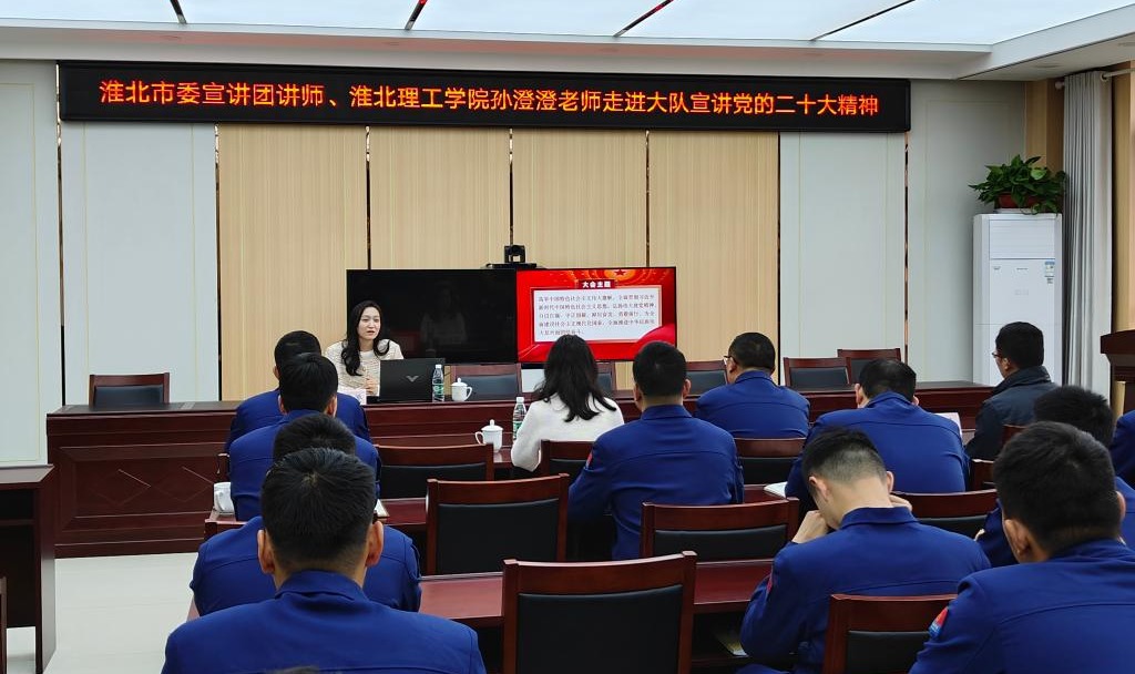 为积极贯彻落实习近平总书记关于“大思政课”建设的重要指示,深入推进社会实践基地共建共享工作走深走实。3月29日下午Beat365唯一官方网站走进合作共建实践基地相山区消防救援大队与其开展首次合作共建,由淮北理工学院Beat365唯一官方网站孙澄澄老师向大队的各位消防指战员们进行党的二十大报告宣讲,Beat365唯一官方网站院长助理陈志操、骨干教师白慎志陪同出席,相山区消防救援大队政治教导员芦冬冬主持会议,全体指战员参加宣讲会。