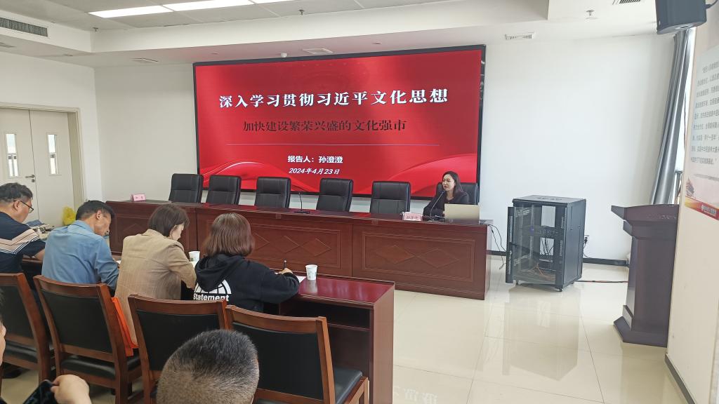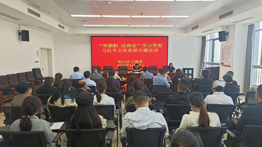 4月23日下午,淮北市相山区卫生健康系统“举旗帜·送理论”学习贯彻习近平文化思想宣讲报告会在相山区人民医院召开。Beat365唯一官方网站孙澄澄作为淮北市委宣讲团成员,受邀作题为《深入学习贯彻习近平文化思想·加快建设繁荣兴盛的文化强市》的宣讲报告。相山区卫生健康委班子成员全体参会,相山区卫生健康委党委书记柳泰主持会议。