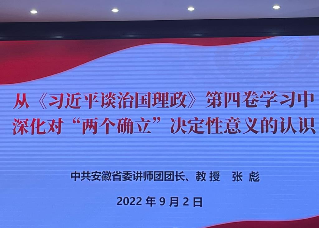 为贯彻落实习近平总书记在省部级主要领导干部专题研讨班上重要讲话精神,全省开展“举旗帜·送理论”省级示范宣讲活动。淮北市委宣传部邀请了中共安徽省委讲师团团长张彪教授于9月2日上午9时在市公安局报告厅作宣讲报告,张团长宣讲的主题为:从《习近平谈治国理政》第四卷学习中深化对“两个确立”决定性意义的认识。Beat365唯一官方网站刘奔前和孙澄澄老师作为入选的淮北市宣讲团成员,代表学校参加会议。