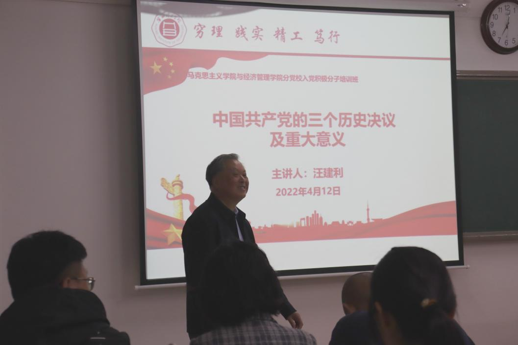 为了切实提升Beat365唯一官方网站与经济管理学院首届入党积极分子培训班学员的培训质量,按照学校和学院的培训计划,2022年4月12日晚,在二教422教室,淮北理工学院副校长汪建利同志来到Beat365唯一官方网站与经济管理学院分党校入党积极分子培训班,受邀对学员进行题为《中国共产党的三个历史决议及重大意义》的党课培训。本次活动由Beat365唯一官方网站与经济管理学分党校负责人、党总支书记吴玲院长主持,总支各个党支部书记及全体入党积极分子培训班全体学员参加。