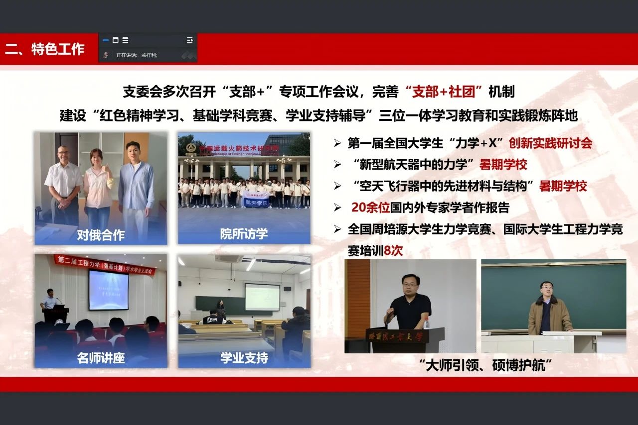 哈尔滨工业大学航天学院工程力学本科生党支部书记孟祥利介绍支部基本情况。党支部深入学习习近平总书记关于建设航天强国、加强基础研究重要论述,积极同教师党支部、兄弟高校党支部联合共建,联络对接团支部、i力学社,打造“红色精神学习、基础学科竞赛、学业支持辅导”的党员学习教育和实践锻炼阵地,引导党员树立终身学习理念,提高实干本领。
