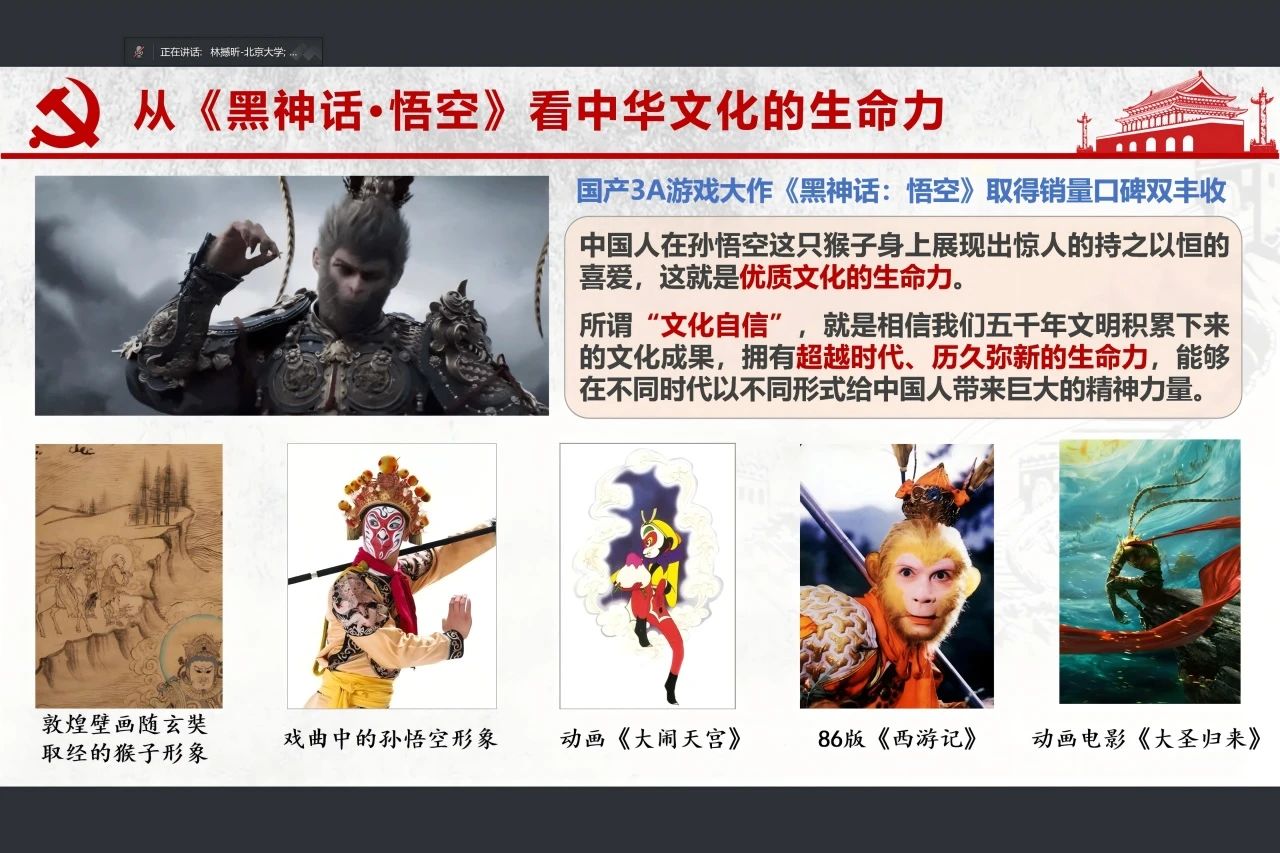 威尼斯金沙欢乐娱人城航空研究生党支部回顾新中国成立75周年以来在文化建设方面的发展成就,介绍不同阶段文化建设的特点,通过数据对比和具体案例展现新中国在文化发展方面取得的辉煌成绩。国产3A游戏大作《黑神话:悟空》不仅在游戏界引发“地震”,更在文化界“出圈”,体现出优质文化超越时代、历久弥新的生命力;中国理想都城秩序的代表性杰作——“北京中轴线”的成功申遗,体现的是中华文明“中庸”“和谐”的文化传统和独特的审美意趣。“文化兴国运兴,文化强民族强”,在新的起点上继续推动文化繁荣、建设文化强国、建设中华民族现代文明,是我们在新时代新的文化使命。