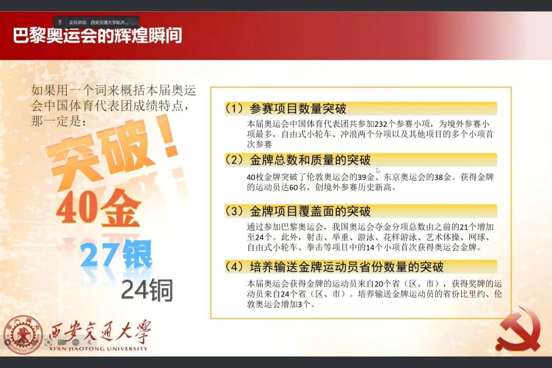西安交通大学航天航空学院2023级硕士生第一党支部回顾新中国成立75周年的以来在体育建设方面的发展成就。人民健康是民族昌盛和国家强盛的重要标志,75年来,中国人撕掉“东亚病夫”的标签,让五星红旗在国际赛场高高飘扬,体育运动走进万千百姓的日常生活,从百年奥运梦圆到树立奥林匹克运动新标杆……在刚刚结束的巴黎奥运会上,中国体育代表团勇夺40金27银24铜共91枚奖牌,取得我国夏季奥运会境外参赛历史最好成绩,金牌数与美国队并列第一,生动诠释了新时代中国精神,充分展示了中国作为世界体育大国、奥运强国的实力,折射出新时代建设体育强国、健康中国的成就。