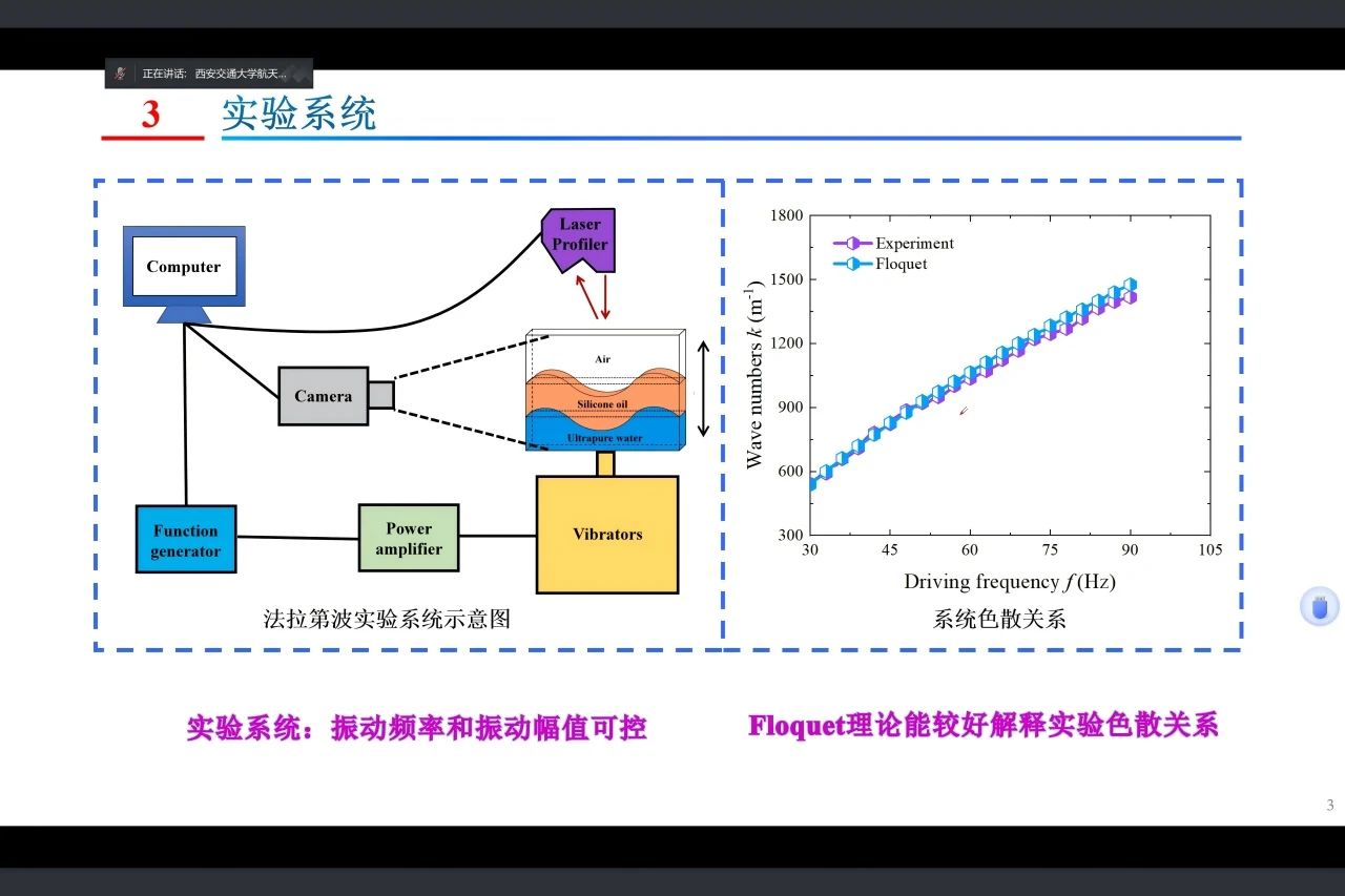 西安交通大学航天航空学院2023级硕士生、航天航空学院研究生学术年会三等奖获得者龚庆同志以《Hele-Shaw水槽中三相流体Faraday失稳模态转变研究》为汇报题目分享自己的科研成果。Faraday不稳定性在液滴自组装、波的模态变化等领域都有着广泛的应用,基于Floquet线性稳定性分析理论和Faraday波实验平台,探究Hele-Shaw水槽中三相流体Faraday失稳模态转变以及界面耦合机制。